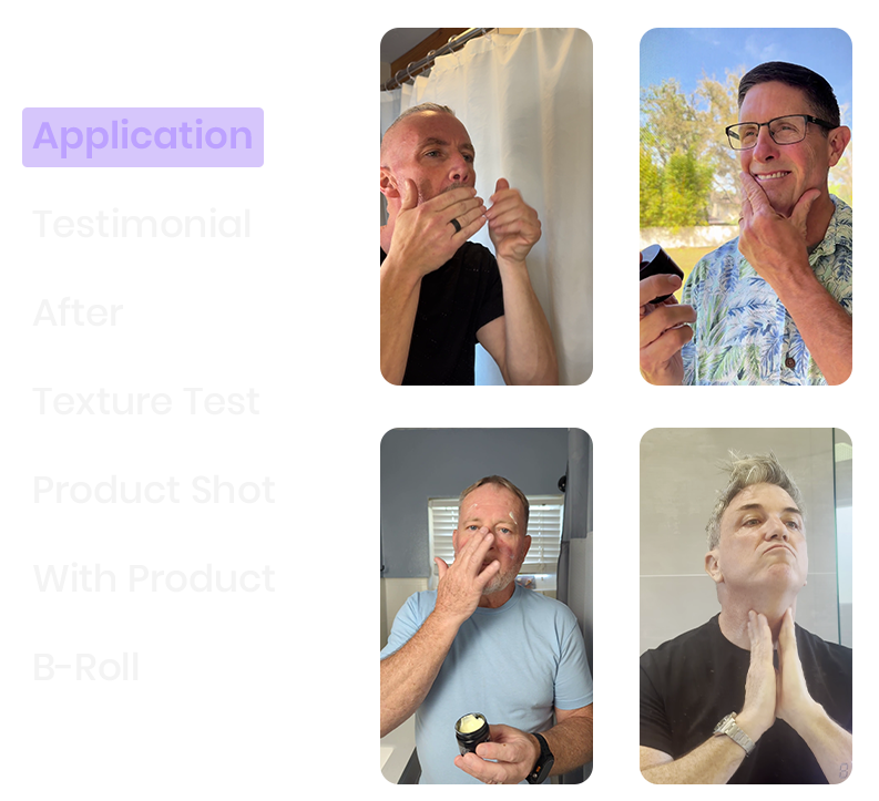 Skincare for Men brands refresh creatives 3x faster when they organize by ad shots. By instantly pulling every 'Testimonial' clip, from bathroom routines to close-up results, they can rapidly build new high-converting ads.
