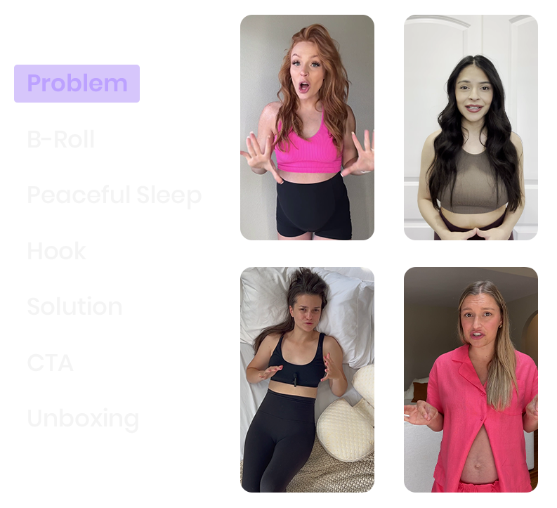 Every ad shot below is drawn from real maternity products brand data. These aren't generic templates—they're the actual building blocks winning brands use to maximize footage reuse.