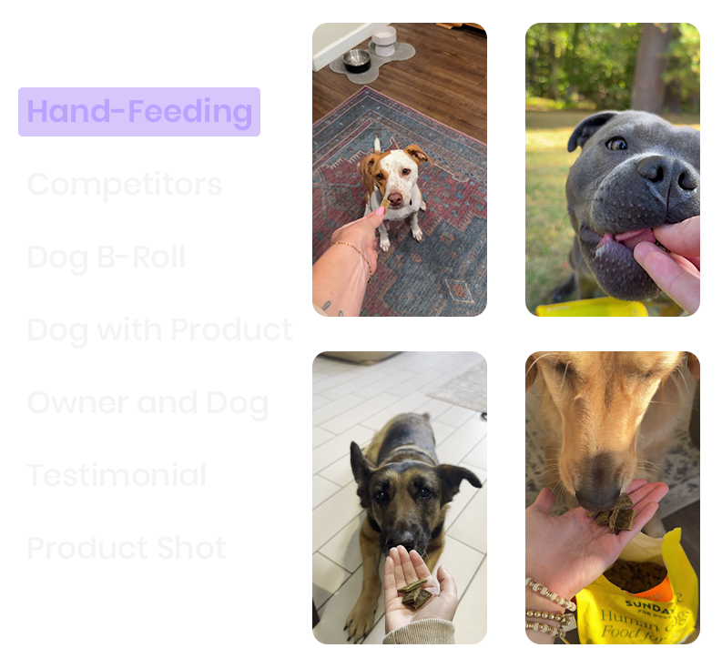 Every ad shot below is drawn from real dog food brand data. These aren't generic templates—they're the actual building blocks winning brands use to maximize footage reuse.