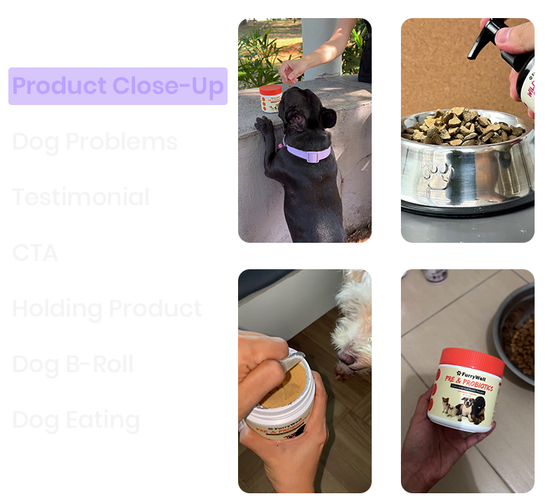 Every ad shot below is drawn from real dog supplements brand data. These aren't generic templates—they're the actual building blocks winning brands use to maximize footage reuse.